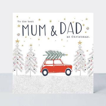 A festive Christmas card for Mum & Dad full of cheer. Featuring rich jewel tones highlighted by shiny gold foil and dazzling hand-applied gems. Printed on textured card and paired with a bright red envelope for an extra special touch.