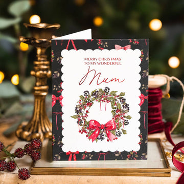 This Christmas card, dedicated to my Wonderful Mum, features a refined wreath design and is printed on textured card-stock from sustainably managed forests. It comes paired with an elegant crimson envelope for a classic holiday touch.