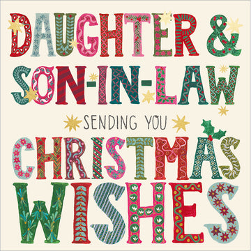 Brighten the season with this Daughter & Son in Law Christmas card, featuring bold and fun typography that adds a lively touch to your festive greetings. Its playful design makes it a joyful way to send warm wishes to your loved ones this season.
