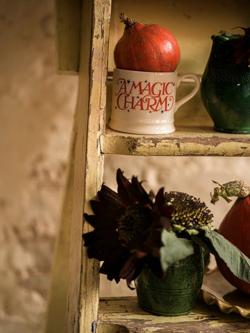 The Emma Bridgewater Halloween Toast Magic charm small mug has 'A magic charm' written in a spooky pumpkin orange. Perfect size for smaller people but still as lovely for Halloween filled with warming hot chocolate and marshmallows.