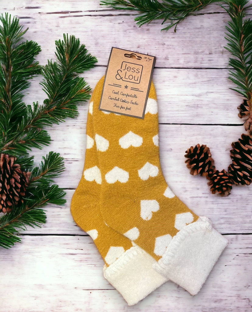The plush cuff provides gentle support and warmth, while the love heart motif adds a touch of whimsy to your everyday essentials. Perfect for gifting or personal indulgence, these socks combine softness with sentiment.