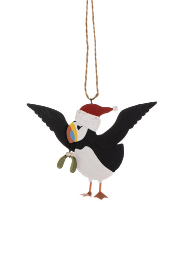 Bring some festive cheer with this delightful puffin flying with mistletoe decoration. Its playful design captures the charm of this beloved bird carrying a sprig of mistletoe, perfect for adding a whimsical touch to your holiday decor.