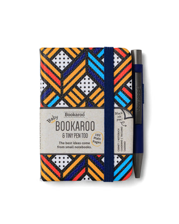 The Baby Bookaroo A7 Navy and Yellow Geo notebook & Tiny pen too easily fits in your pocket, ready to capture your creativity anytime, anywhere.